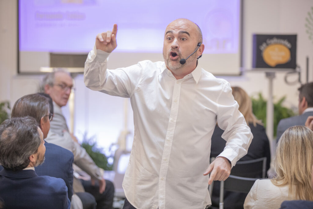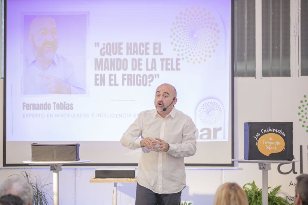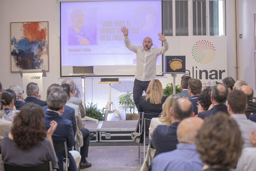 El evento se ha celebrado en la Fábrica de Gomas de Pamplona y ha reunido a la práctica totalidad de representantes de las empresas socias de ALINAR, así como a diversos agentes vinculados al sector agroalimentario de las tres comunidades autónomas que representa. El acto ha contado con la participación de Fernando Tobías, Experto en Mindfulness e Inteligencia Emocional, quien ha presentado su ponencia “¿Qué hace el mando de la tele en el frigo?”, un monólogo terapéutico desenfadado en el que ha adaptado su libro homónimo. Tobías, terapeuta y coach, ha realizado, en colaboración con los asistentes, diferentes dinámicas con las que ha mostrado herramientas que permitan desarrollar una atención eficiente, gestionar mejor el estrés y llevar conciencia sobre la importancia de saber parar.